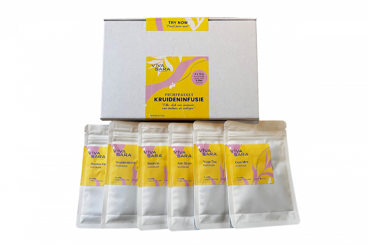 Probeer zes unieke smaken in één stijlvol verpakt setje. Ons proefpakket bevat 6 x 15 g (goed voor 6 liter) van zorgvuldig samengestelde kruidenmixen, perfect voor verfrissing en ontspanning op elk moment van de dag. Deze geschenkverpakking maakt het ook een ideaal cadeau om te geven – of om jezelf te verwennen. Proef, geniet, en vind jouw nieuwe favoriete kruideninfusie. Ook verkrijgbaar in fruit infusie.
